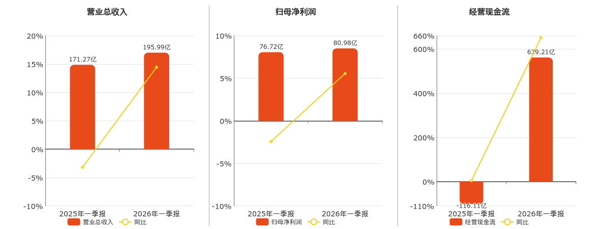 公司营业总收入为195.99亿元,在已披露的同业公司中排名第2,较去年同报告期营业总收入增加24.72亿元,同比较去年同期上涨14.43%。归母净利润为80.98亿元,在已披露的同业公司中排名第2,较去年同报告期归母净利润增加4.26亿元,同比较去年同期上涨5.55%。经营活动现金净流入为639.21亿元,在已披露的同业公司中排名第2,较去年同报告期经营活动现金净流入增加755.32亿元,实现3年连续上涨。