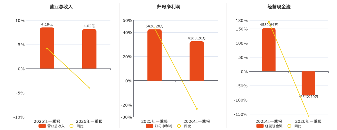 公司营业总收入为4.02亿元,较去年同报告期营业总收入减少1656.44万元,同比较去年同期下降3.96%。归母净利润为4160.26万元,较去年同报告期归母净利润减少1266.02万元,同比较去年同期下降23.33%。经营活动现金净流入为-2542.70万元,较去年同报告期经营活动现金净流入减少7075.55万元,同比较去年同期下降156.10%。