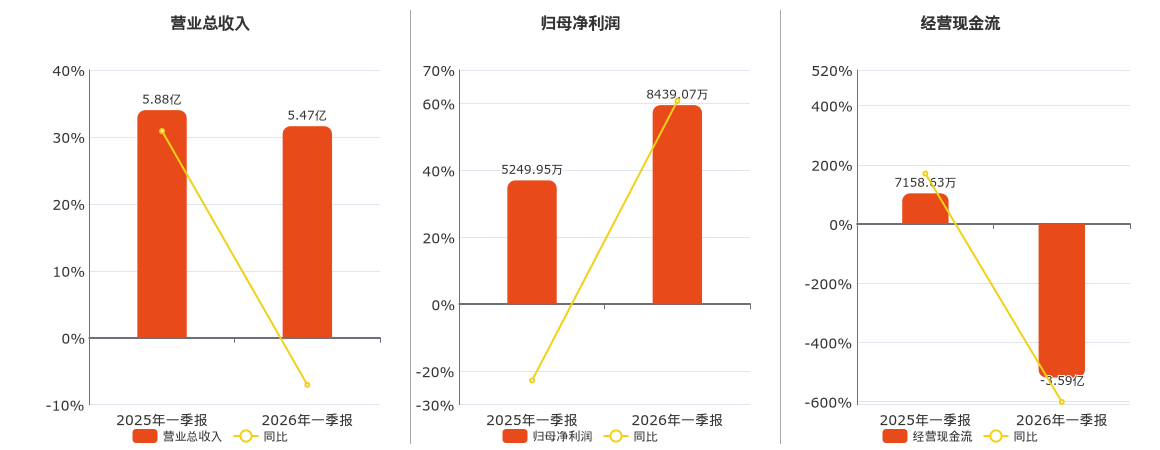 公司营业总收入为5.47亿元,较去年同报告期营业总收入减少4137.20万元,同比较去年同期下降7.04%。归母净利润为8439.07万元。经营活动现金净流入为-3.59亿元,在已披露的同业公司中排名第7,较去年同报告期经营活动现金净流入减少4.30亿元,同比较去年同期下降600.83%。