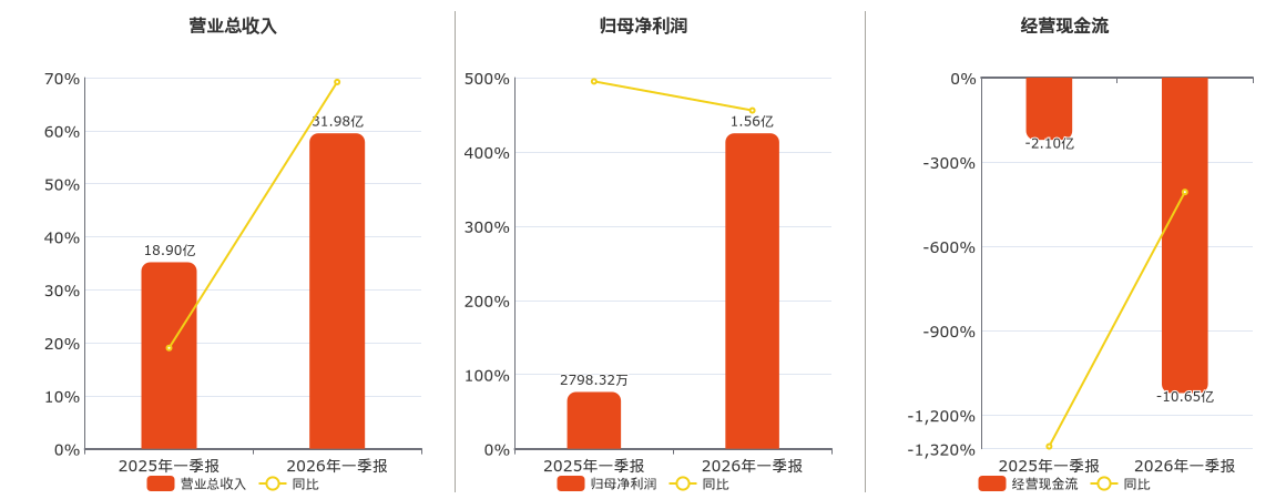 公司营业总收入为31.98亿元,较去年同报告期营业总收入增加13.08亿元,实现5年连续上涨,同比较去年同期上涨69.17%。归母净利润为1.56亿元,较去年同报告期归母净利润增加1.28亿元,实现5年连续上涨,同比较去年同期上涨455.78%。经营活动现金净流入为-10.65亿元。