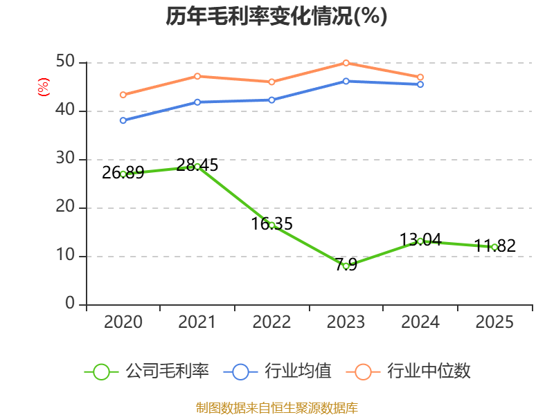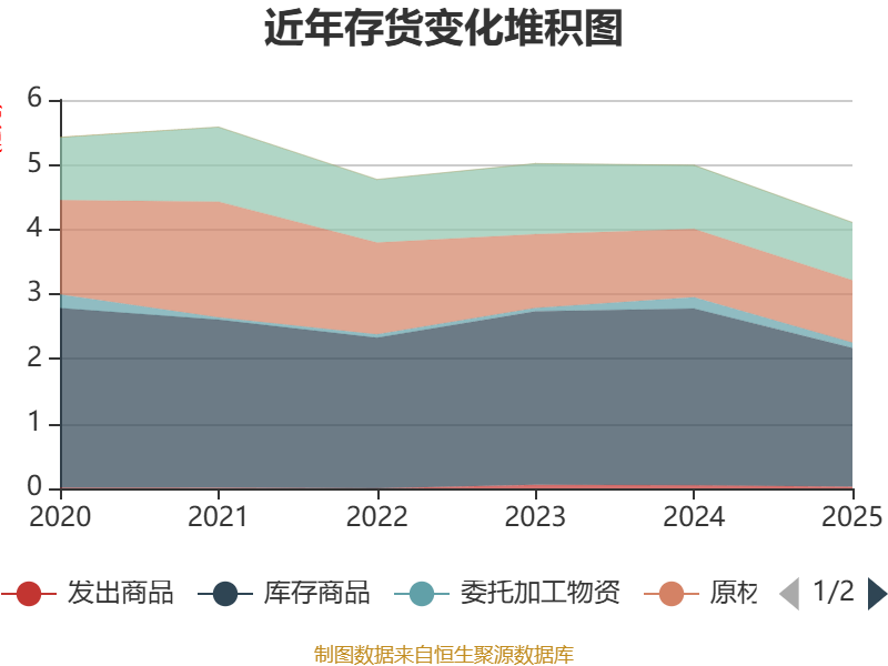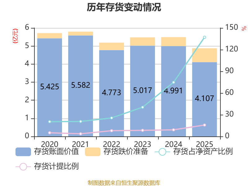 从存货变动来看,截至2025年末,公司存货账面价值为4.11亿元,占净资产的137.06%,较上年末减少8840.25万元。其中,存货跌价准备为7662.77万元,计提比例为15.72%。