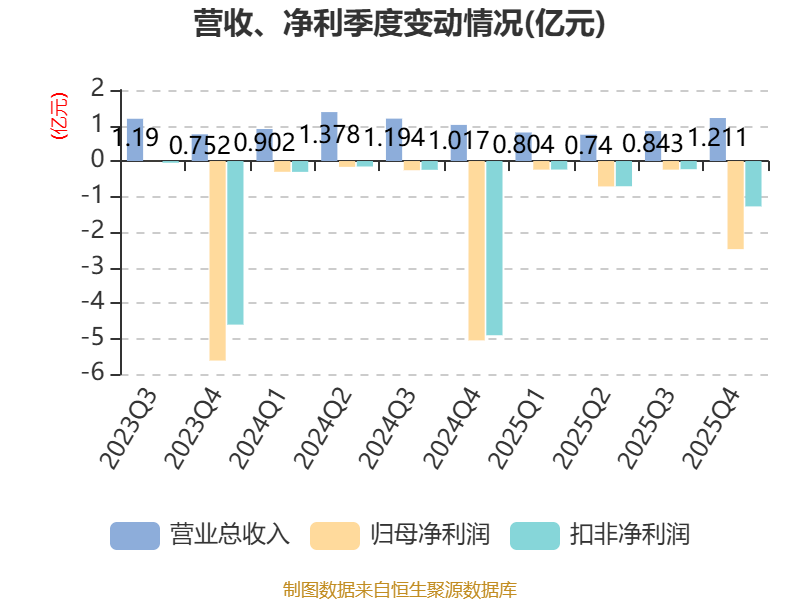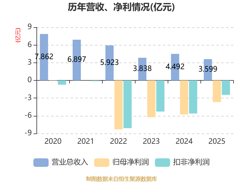 中证智能财讯如意集团(002193)4月28日披露2025年年度报告。2025年,公司实现营业总收入3.6亿元,同比下降19.89%;归母净利润亏损3.68亿元,上年同期亏损5.77亿元;扣非净利润亏损2.46亿元,上年同期亏损5.61亿元;经营活动产生的现金流量净额为306.2万元,上年同期为-768.63万元;报告期内,如意集团基本每股收益为-1.4061元,加权平均净资产收益率为-76.08%。