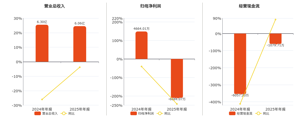 公司营业总收入为6.06亿元,在已披露的同业公司中排名第35,较去年同报告期营业总收入减少2405.75万元,同比较去年同期下降3.82%。归母净利润为-6684.07万元,在已披露的同业公司中排名第36,较去年同报告期归母净利润减少1.13亿元,同比较去年同期下降243.31%。经营活动现金净流入为-1079.71万元,在已披露的同业公司中排名第37,较去年同报告期经营活动现金净流入增加4977.49万元。