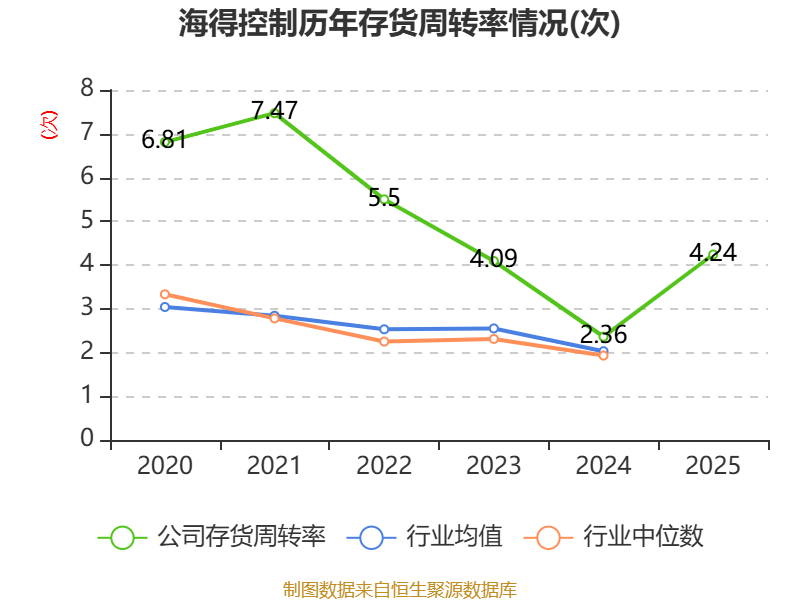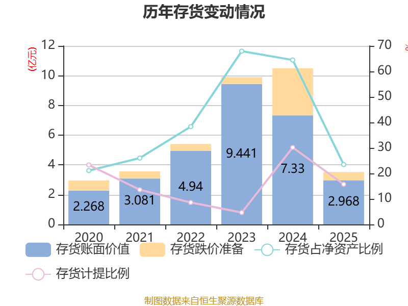 从存货变动来看,截至2025年末,公司存货账面价值为2.97亿元,占净资产的23.48%,较上年末减少4.36亿元。其中,存货跌价准备为5543.49万元,计提比例为15.74%。