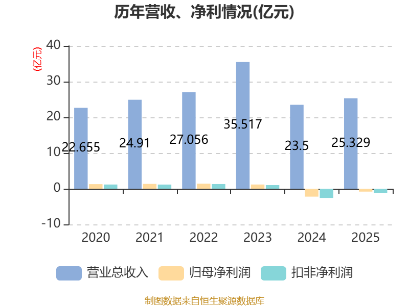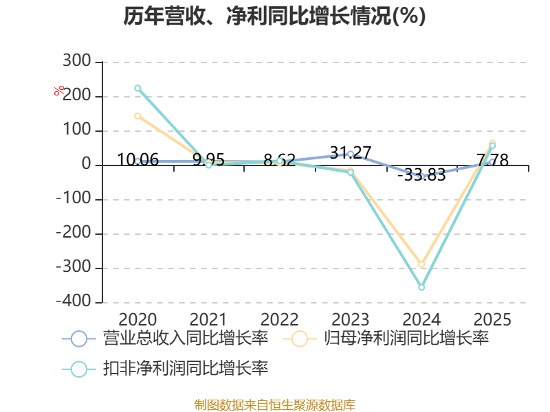 中证智能财讯海得控制(002184)4月28日披露2025年年度报告。2025年,公司实现营业总收入25.33亿元,同比增长7.78%;归母净利润亏损8200.39万元,上年同期亏损2.23亿元;扣非净利润亏损1.14亿元,上年同期亏损2.59亿元;经营活动产生的现金流量净额为-1.65亿元,上年同期为-3.92亿元;报告期内,海得控制基本每股收益为-0.233元,加权平均净资产收益率为-7.45%。