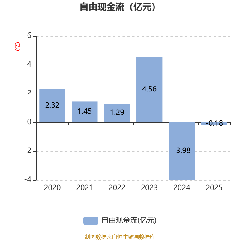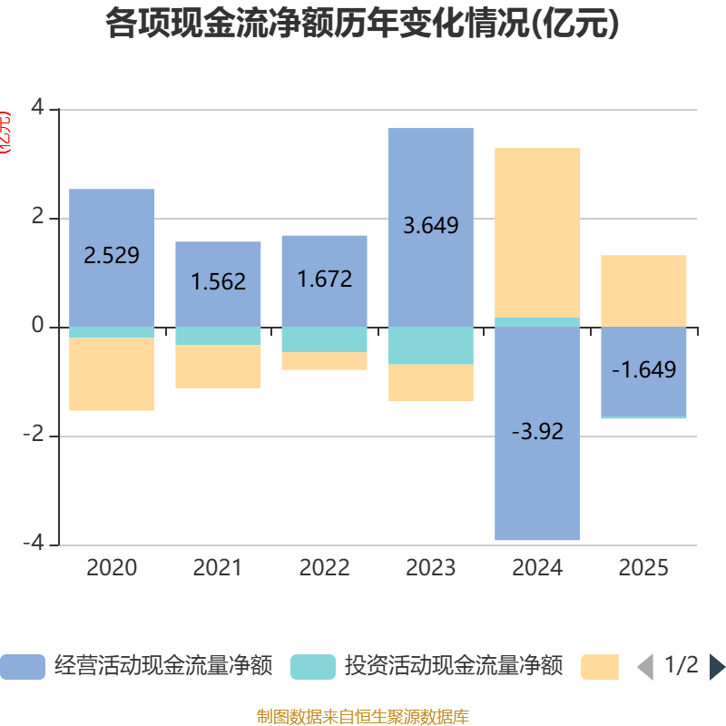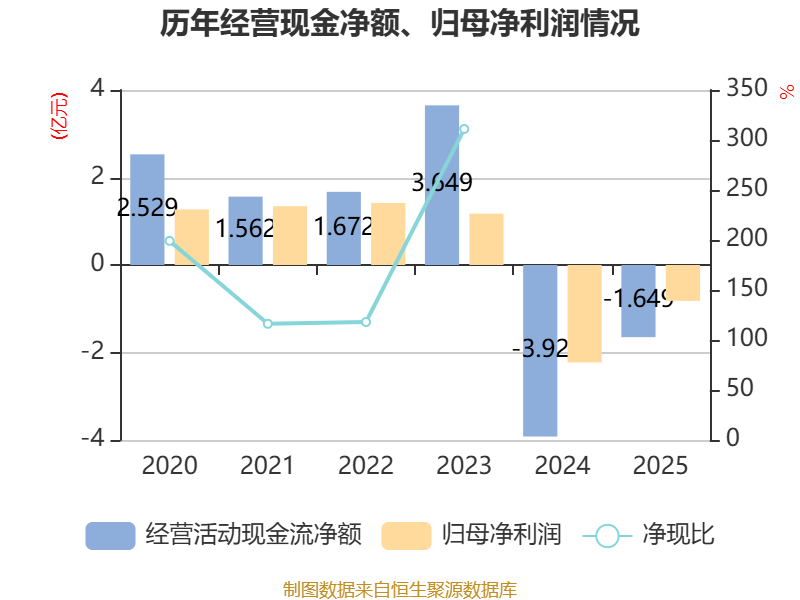 截至2025年,公司经营活动现金流净额为-1.65亿元,同比增加2.27亿元;筹资活动现金流净额1.31亿元,同比减少1.8亿元;投资活动现金流净额-384.01万元,上年同期为1666.85万元。