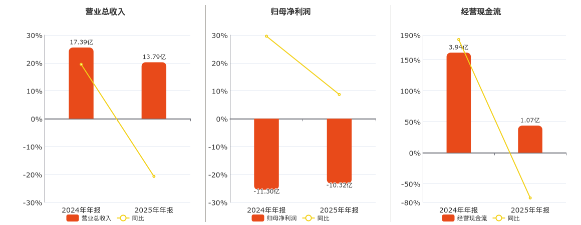 公司营业总收入为13.79亿元。归母净利润为-10.32亿元,较去年同报告期归母净利润增加9795.25万元,实现2年连续上涨。经营活动现金净流入为1.07亿元。
