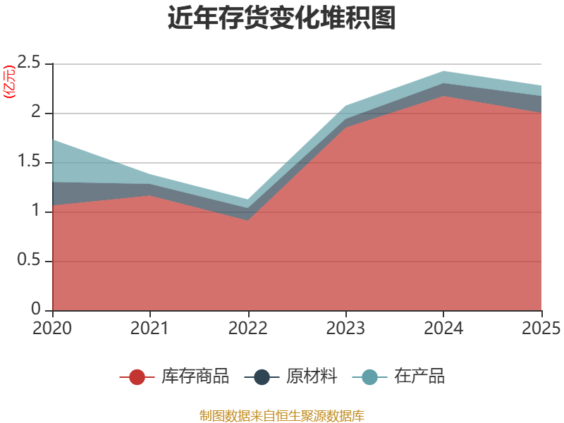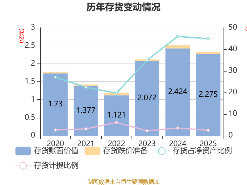 从存货变动来看,截至2025年末,公司存货账面价值为2.28亿元,占净资产的44.98%,较上年末减少1492.53万元。其中,存货跌价准备为584.16万元,计提比例为2.5%。