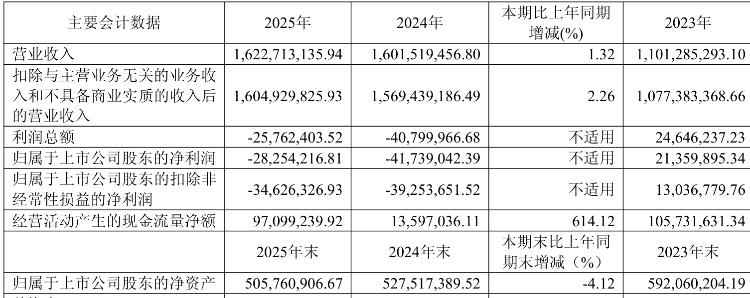 中证智能财讯中源家居(603709)4月28日披露2025年年度报告。2025年,公司实现营业总收入16.23亿元,同比增长1.32%;归母净利润亏损2825.42万元,上年同期亏损4173.9万元;扣非净利润亏损3462.63万元,上年同期亏损3925.37万元;经营活动产生的现金流量净额为9709.92万元,同比增长614.12%;报告期内,中源家居基本每股收益为-0.23元,加权平均净资产收益率为-5.47%。公司2025年度分配预案为:拟向全体股东每10股转3股,派现0.8元(含税)。