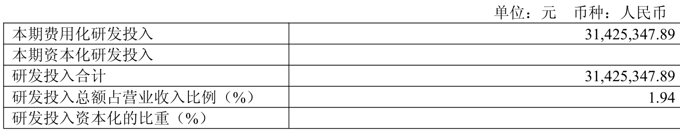 2025年全年,公司研发投入金额为3142.53万元,同比增长2.02%;研发投入占营业收入比例为1.94%,相比上年同期上升0.02个百分点。