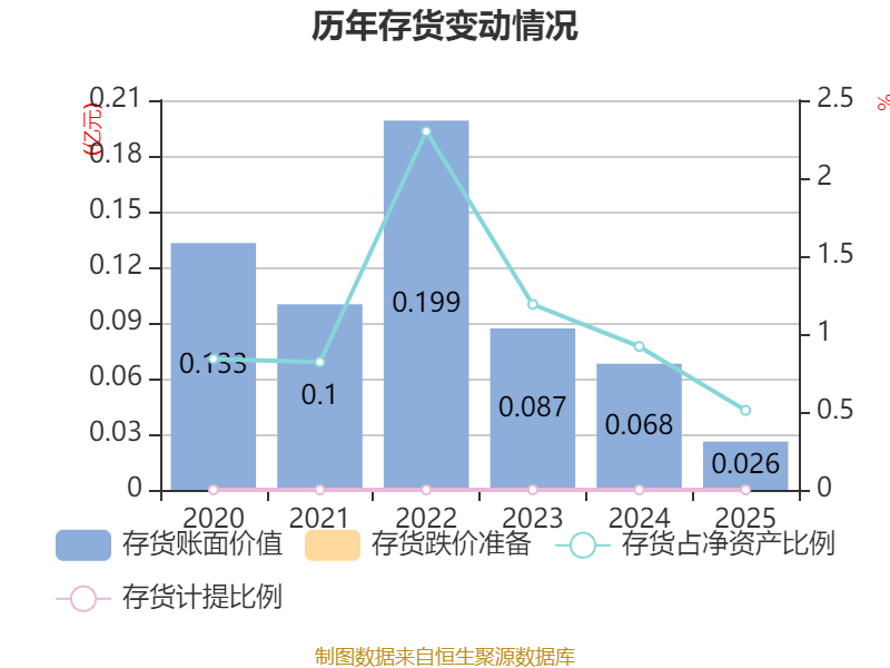 从存货变动来看,截至2025年末,公司存货账面价值为260.5万元,占净资产的0.51%,较上年末减少421.45万元。公司本期没有计提存货跌价准备。