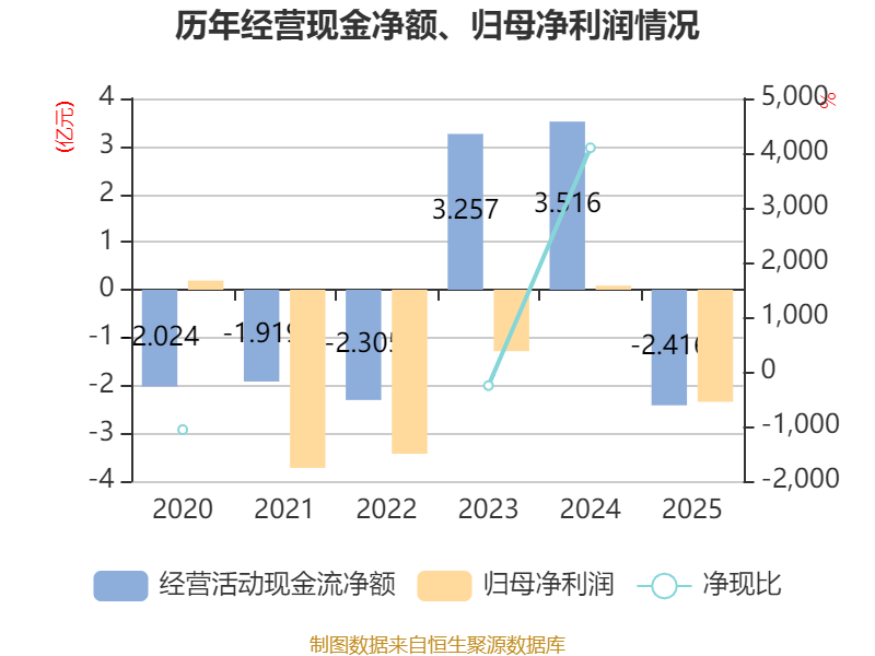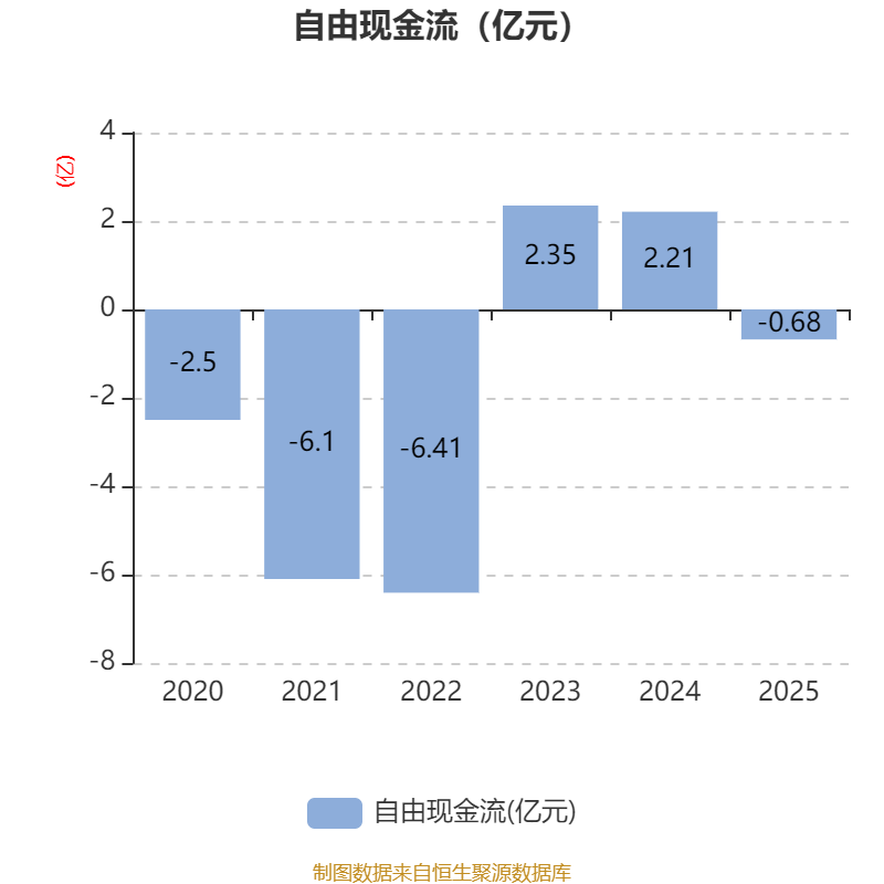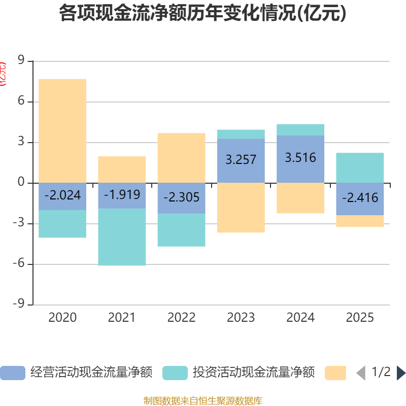 截至2025年,公司经营活动现金流净额为-2.42亿元,同比减少5.93亿元;筹资活动现金流净额-8530.99万元,同比增加1.41亿元;投资活动现金流净额2.21亿元,上年同期为8101.55万元。