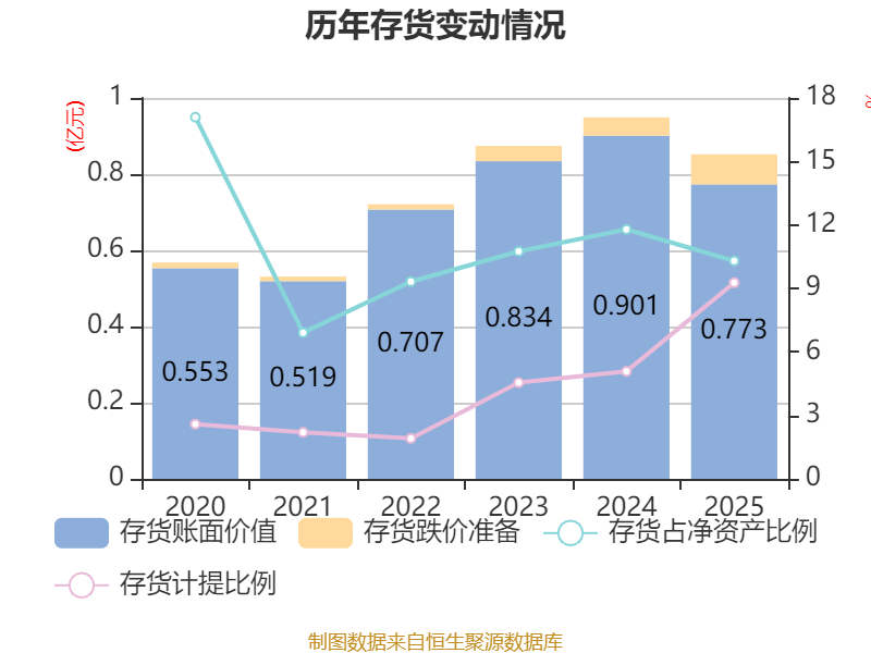 从存货变动来看,截至2025年末,公司存货账面价值为7731.12万元,占净资产的10.3%,较上年末减少1282.07万元。其中,存货跌价准备为790.34万元,计提比例为9.27%。