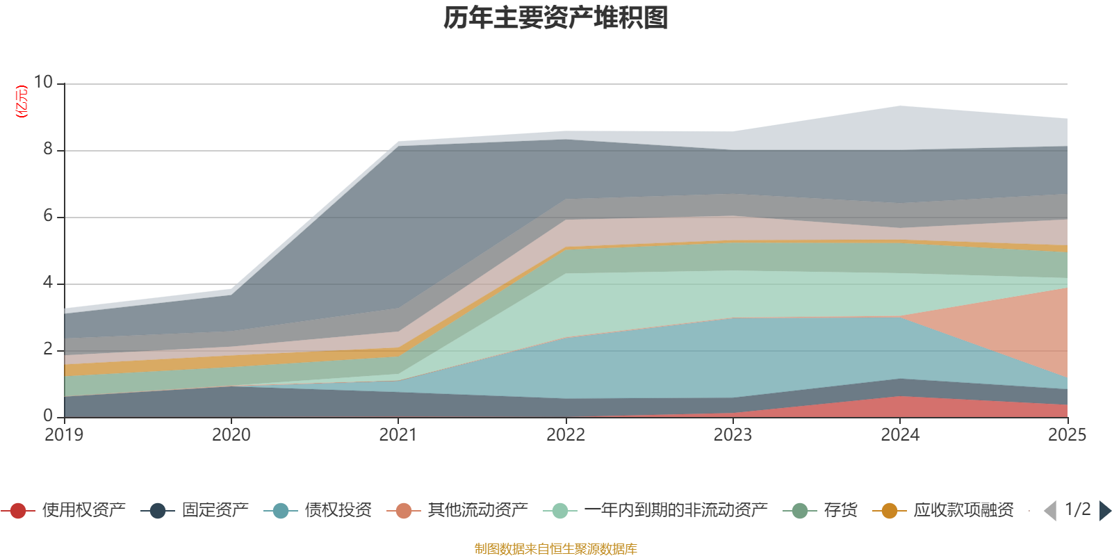 资产重大变化方面,截至2025年末,公司其他流动资产较上年末增加5485.69%,占公司总资产比重上升29.65个百分点;债权投资较上年末减少81.37%,占公司总资产比重下降15.8个百分点;一年内到期的非流动资产较上年末减少77.16%,占公司总资产比重下降10.47个百分点;交易性金融资产合计较上年末增加122.87%,占公司总资产比重上升4.95个百分点。