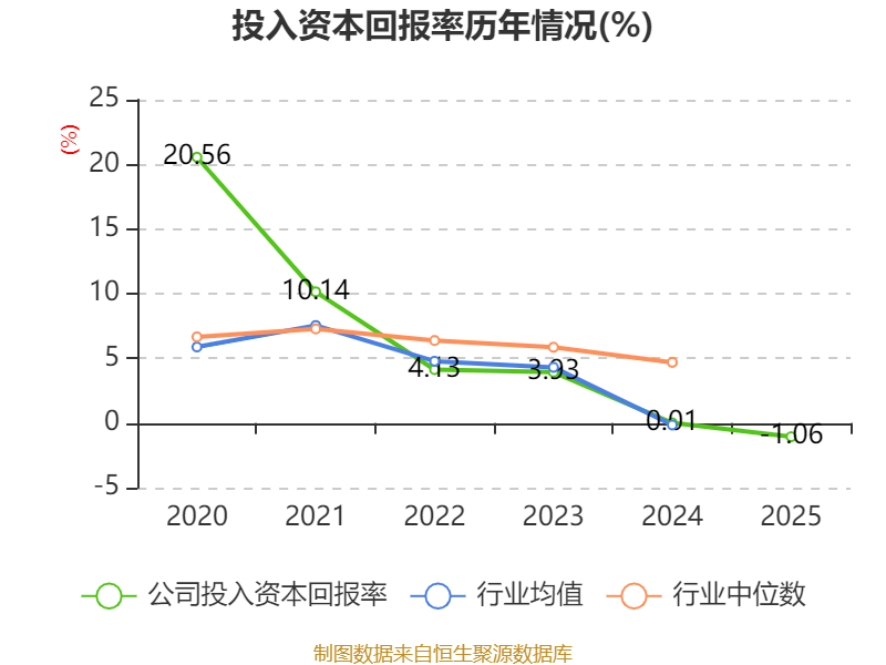 数据显示,2025年公司加权平均净资产收益率为-0.59%,较上年同期下降1.13个百分点。公司2025年投入资本回报率为-1.06%,较上年同期下降1.07个百分点。