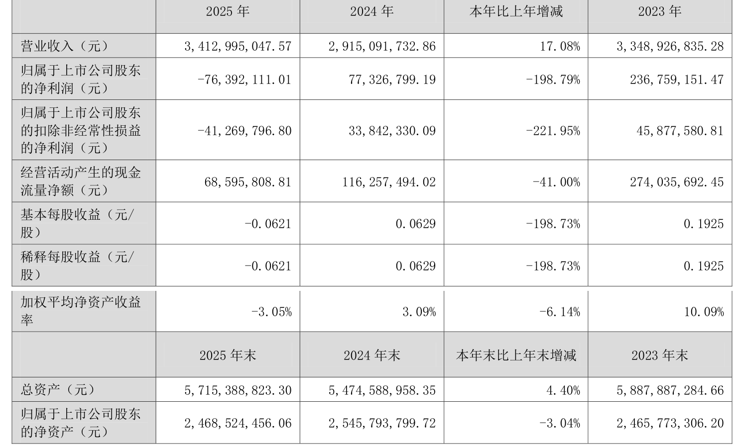 中证智能财讯通鼎互联(002491)4月28日披露2025年年度报告。2025年,公司实现营业总收入34.13亿元,同比增长17.08%;归母净利润亏损7639.21万元,上年同期盈利7732.68万元;扣非净利润亏损4126.98万元,上年同期盈利3384.23万元;经营活动产生的现金流量净额为6859.58万元,同比下降41.00%;报告期内,通鼎互联基本每股收益为-0.0621元,加权平均净资产收益率为-3.05%。