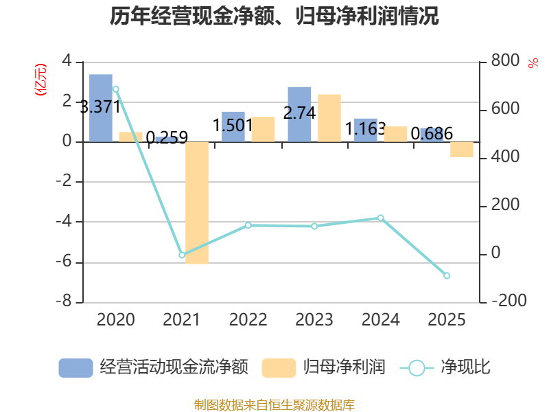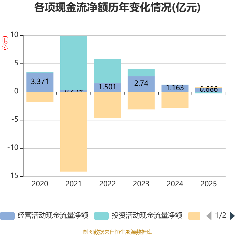 截至2025年,公司经营活动现金流净额为6859.58万元,同比下降41%;筹资活动现金流净额895.25万元,同比增加2.98亿元;投资活动现金流净额-3085.36万元,上年同期为837.27万元。