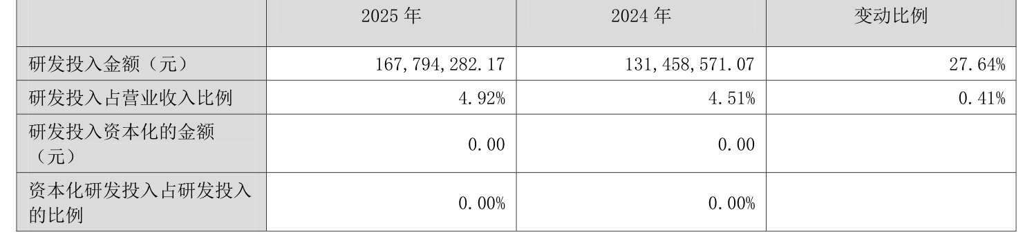 2025年全年,公司研发投入金额为1.68亿元,同比增长27.64%;研发投入占营业收入比例为4.92%,相比上年同期上升0.41个百分点。此外,公司全年研发投入资本化率为0%。