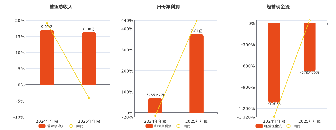 公司营业总收入为8.88亿元,在已披露的同业公司中排名第110,较去年同报告期营业总收入减少3897.11万元,同比较去年同期下降4.20%。归母净利润为2.81亿元。经营活动现金净流入为-9787.99万元,在已披露的同业公司中排名第202。
