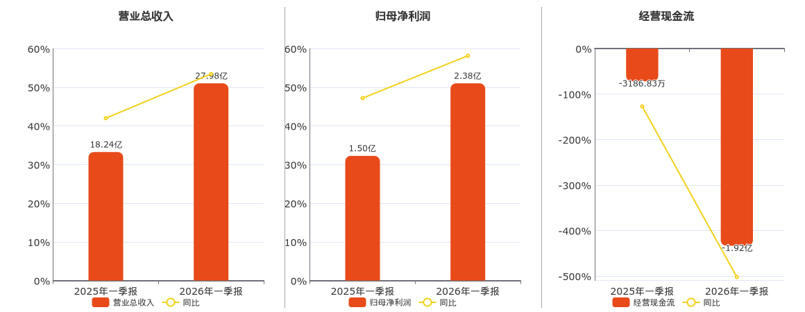 公司营业总收入为27.98亿元。归母净利润为2.38亿元。经营活动现金净流入为-1.92亿元,在已披露的同业公司中排名第54,较去年同报告期经营活动现金净流入减少1.60亿元。