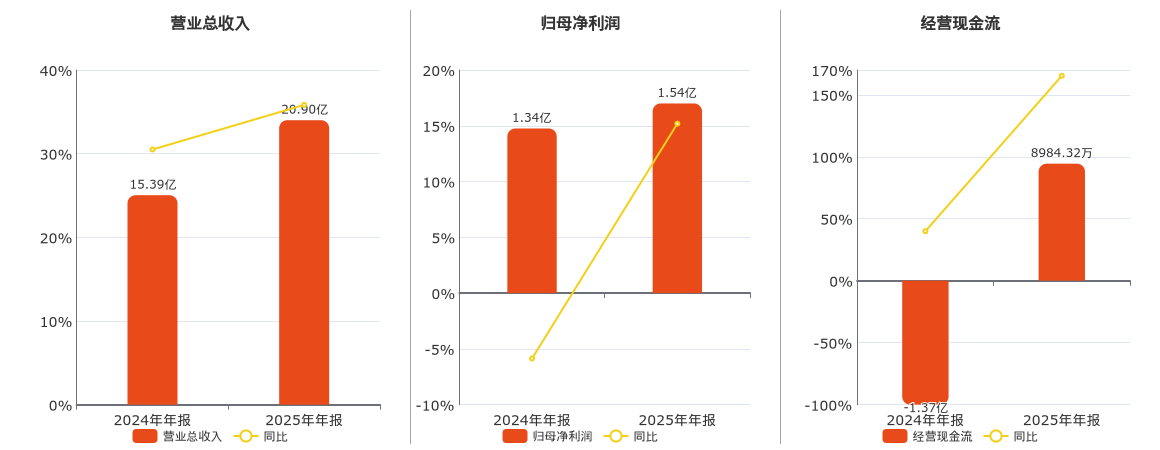 公司营业总收入为20.90亿元。归母净利润为1.54亿元。经营活动现金净流入为8984.32万元,在已披露的同业公司中排名第17。