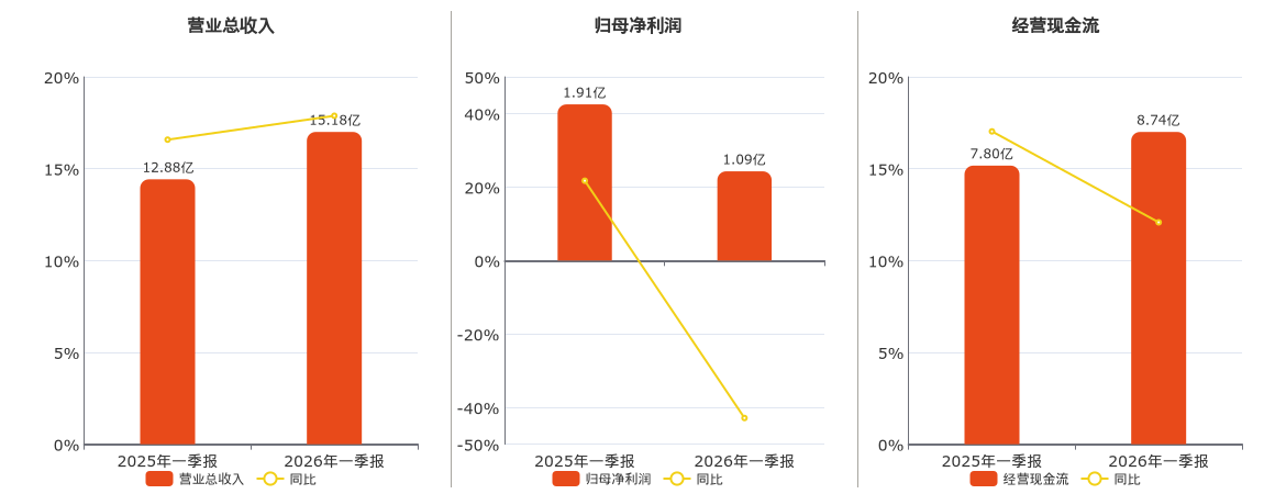 公司营业总收入为15.18亿元,较去年同报告期营业总收入增加2.30亿元,实现5年连续上涨,同比较去年同期上涨17.88%。归母净利润为1.09亿元,较去年同报告期归母净利润减少8169.22万元,同比较去年同期下降42.87%。经营活动现金净流入为8.74亿元,较去年同报告期经营活动现金净流入增加9416.76万元,实现4年连续上涨,同比较去年同期上涨12.08%。