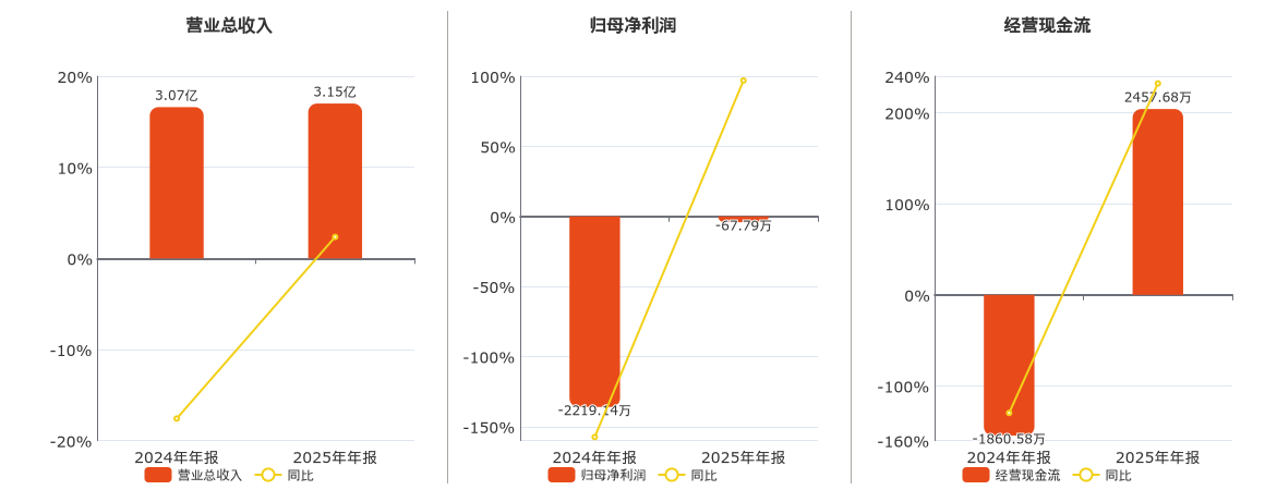公司营业总收入为3.15亿元,在已披露的同业公司中排名第153。归母净利润为-67.79万元,在已披露的同业公司中排名第143。经营活动现金净流入为2457.68万元,在已披露的同业公司中排名第134。