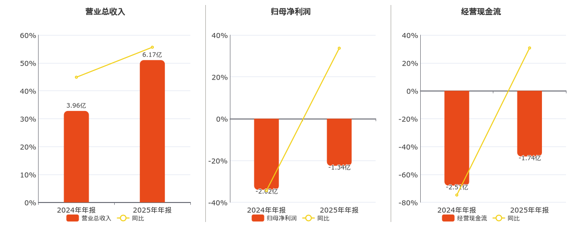 公司营业总收入为6.17亿元,在已披露的同业公司中排名第116。归母净利润为-1.34亿元,在已披露的同业公司中排名第130。经营活动现金净流入为-1.74亿元,在已披露的同业公司中排名第134。