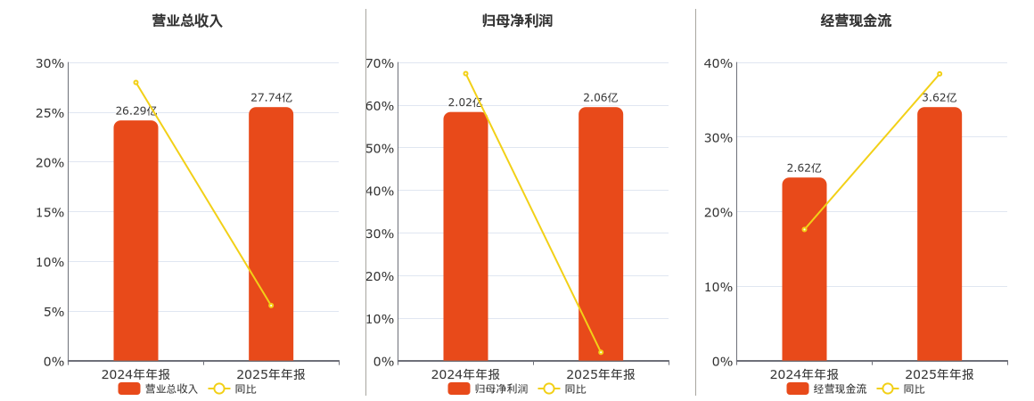 公司营业总收入为27.74亿元,在已披露的同业公司中排名第16。归母净利润为2.06亿元。经营活动现金净流入为3.62亿元。