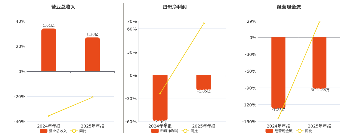 公司营业总收入为1.28亿元,在已披露的同业公司中排名第17,较去年同报告期营业总收入减少3353.75万元,同比较去年同期下降20.80%。归母净利润为-1.05亿元,在已披露的同业公司中排名第15。经营活动现金净流入为-9041.86万元,在已披露的同业公司中排名第16。
