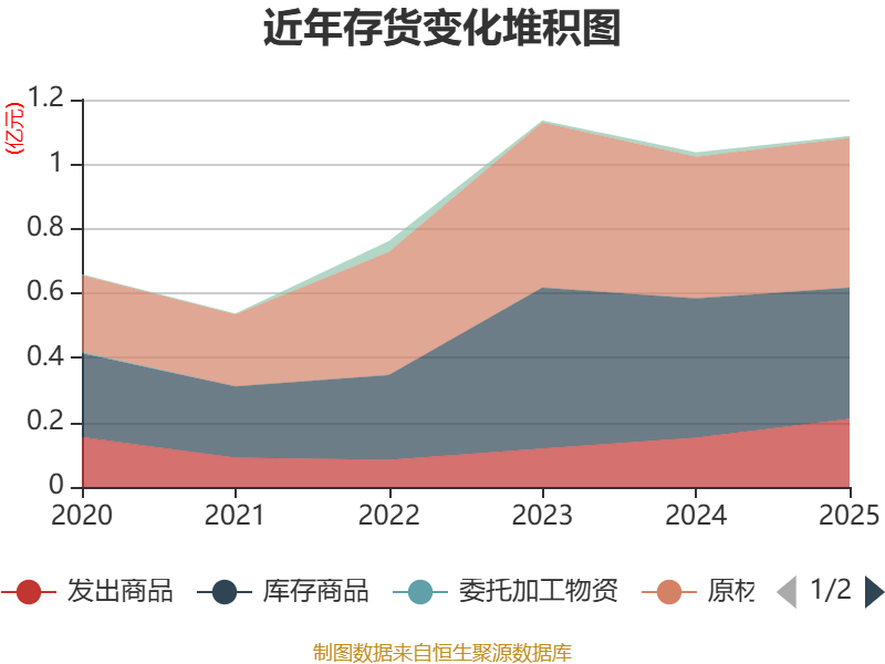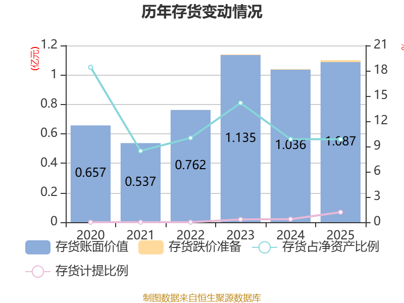 从存货变动来看,截至2025年末,公司存货账面价值为1.09亿元,占净资产的9.85%,较上年末增加507.56万元。其中,存货跌价准备为130.83万元,计提比例为1.19%。
