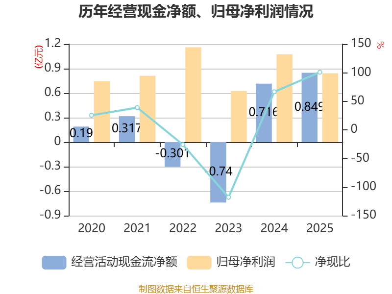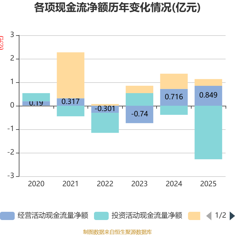 截至2025年,公司经营活动现金流净额为8492.15万元,同比增长18.57%;筹资活动现金流净额2855.29万元,同比减少3620.48万元;投资活动现金流净额-2.28亿元,上年同期为-3861.61万元。