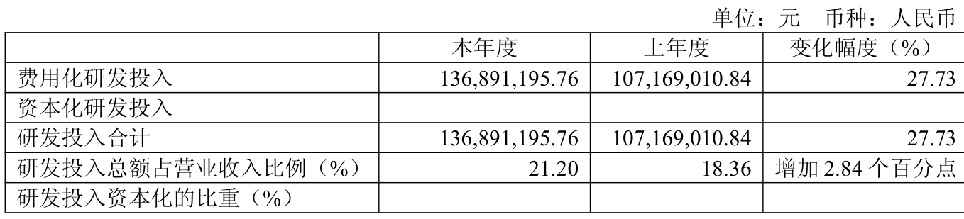 2025年全年,公司研发投入金额为1.37亿元,同比增长27.73%;研发投入占营业收入比例为21.2%,相比上年同期上升2.84个百分点。