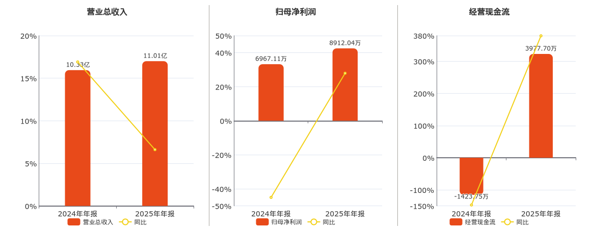 公司营业总收入为11.01亿元。归母净利润为8912.04万元。经营活动现金净流入为3977.70万元,在已披露的同业公司中排名第157。