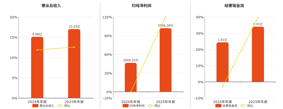 公司营业总收入为10.22亿元,在已披露的同业公司中排名第38。归母净利润为5506.28万元。经营活动现金净流入为1.41亿元。