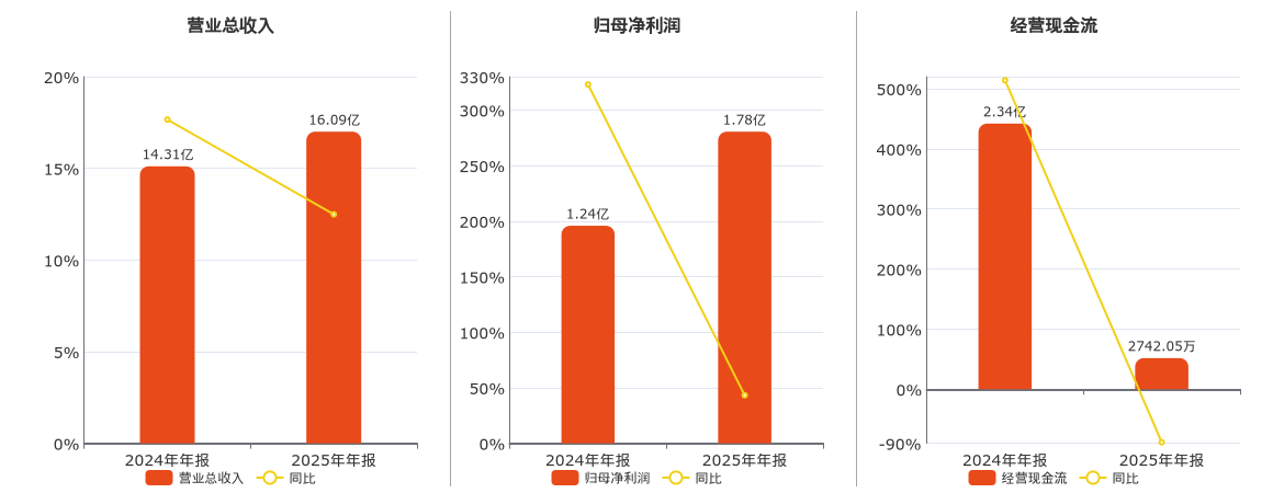 公司营业总收入为16.09亿元。归母净利润为1.78亿元。经营活动现金净流入为2742.05万元,在已披露的同业公司中排名第107,较去年同报告期经营活动现金净流入减少2.06亿元,同比较去年同期下降88.28%。