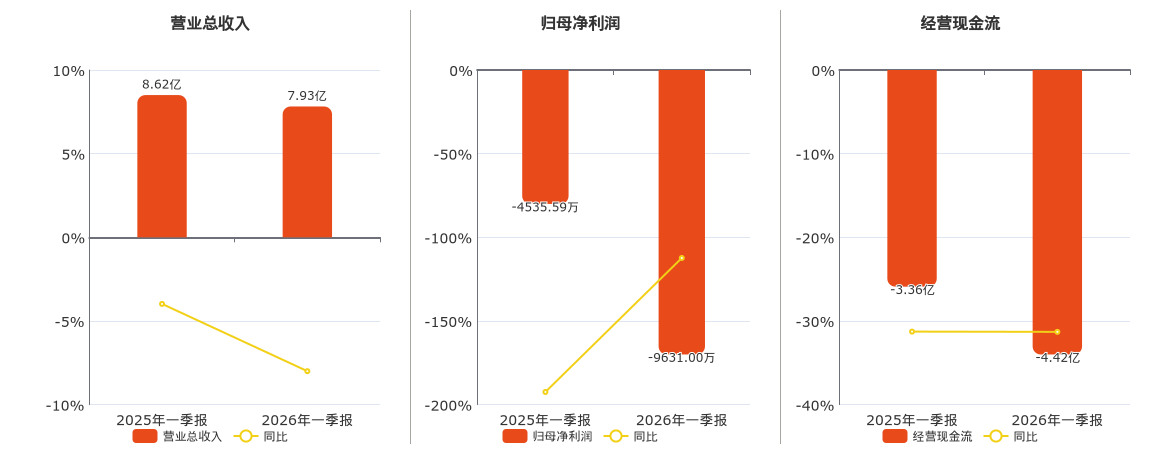 公司营业总收入为7.93亿元,较去年同报告期营业总收入减少6893.67万元,同比较去年同期下降8.00%。归母净利润为-9631.00万元,较去年同报告期归母净利润减少5095.41万元。经营活动现金净流入为-4.42亿元,较去年同报告期经营活动现金净流入减少1.05亿元。