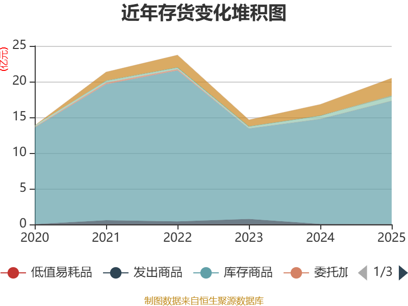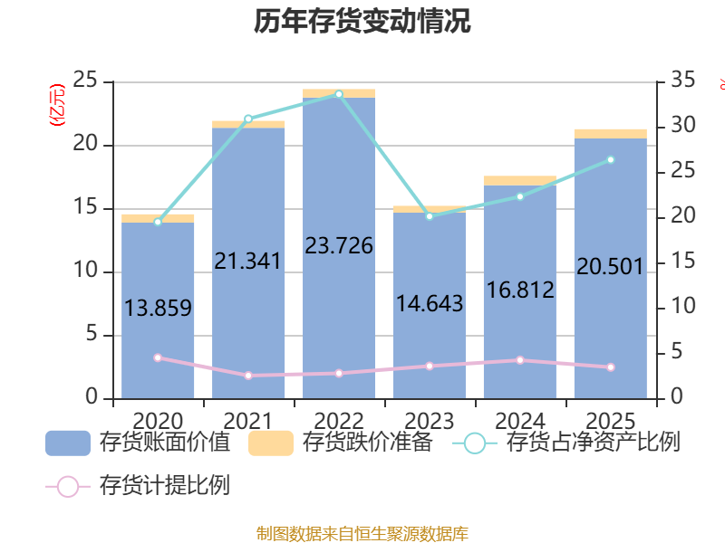 从存货变动来看,截至2025年末,公司存货账面价值为20.5亿元,占净资产的26.35%,较上年末增加3.69亿元。其中,存货跌价准备为7263.98万元,计提比例为3.42%。