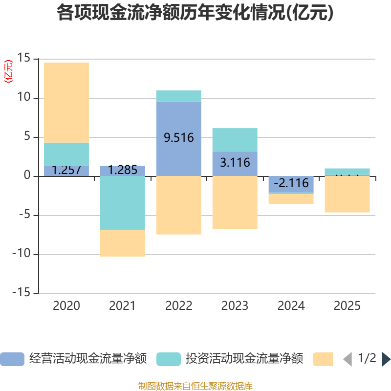 截至2025年,公司经营活动现金流净额为1501.62万元,同比增加2.27亿元;筹资活动现金流净额-4.67亿元,同比减少3.4亿元;投资活动现金流净额8117.14万元,上年同期为-1952.95万元。