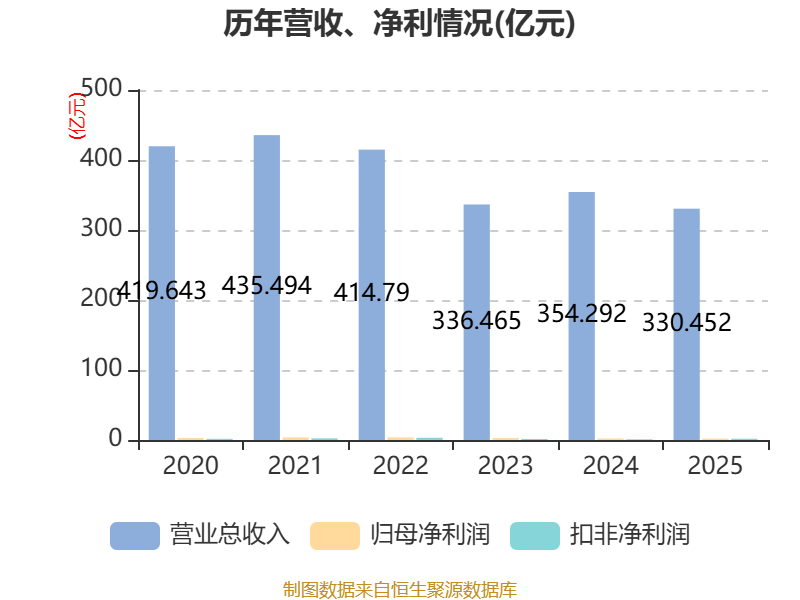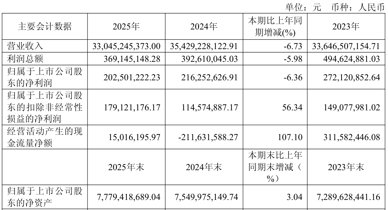 中证智能财讯东方创业(600278)4月28日披露2025年年度报告。2025年,公司实现营业总收入330.45亿元,同比下降6.73%;归母净利润2.03亿元,同比下降6.36%;扣非净利润1.79亿元,同比增长56.34%;经营活动产生的现金流量净额为1501.62万元,上年同期为-2.12亿元;报告期内,东方创业基本每股收益为0.23元,加权平均净资产收益率为2.64%。公司2025年度分配预案为:拟向全体股东每10股派现0.7元(含税)。
