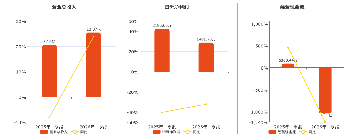 公司营业总收入为10.07亿元,在已披露的同业公司中排名第4,较去年同报告期营业总收入增加1.94亿元,同比较去年同期上涨23.87%。归母净利润为1481.93万元,在已披露的同业公司中排名第5,较去年同报告期归母净利润减少703.72万元,同比较去年同期下降32.20%。经营活动现金净流入为-7.15亿元,在已披露的同业公司中排名第5,较去年同报告期经营活动现金净流入减少7.78亿元,同比较去年同期下降1234.00%。