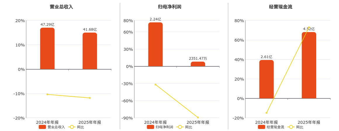 公司营业总收入为41.68亿元,在已披露的同业公司中排名第7,较去年同报告期营业总收入减少5.60亿元,同比较去年同期下降11.85%。归母净利润为2351.47万元,在已披露的同业公司中排名第23,较去年同报告期归母净利润减少2.04亿元,同比较去年同期下降89.66%。经营活动现金净流入为4.52亿元,在已披露的同业公司中排名第3,较去年同报告期经营活动现金净流入增加1.90亿元,同比较去年同期上涨72.89%。