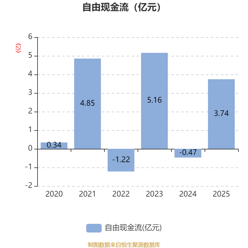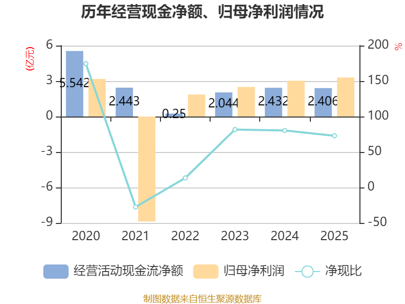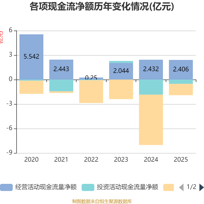 截至2025年,公司经营活动现金流净额为2.41亿元,同比下降1.06%;筹资活动现金流净额-1.39亿元,同比增加4.79亿元;投资活动现金流净额-5260.86万元,上年同期为-1.84亿元。