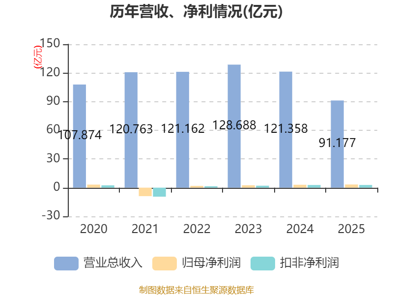 中证智能财讯亚厦股份(002375)4月28日披露2025年年度报告。2025年,公司实现营业总收入91.18亿元,同比下降24.87%;归母净利润3.3亿元,同比增长9.00%;扣非净利润2.8亿元,同比增长1.11%;经营活动产生的现金流量净额为2.41亿元,同比下降1.06%;报告期内,亚厦股份基本每股收益为0.25元,加权平均净资产收益率为4.03%。公司2025年度分配预案为:拟向全体股东每10股派现1.28元(含税)。