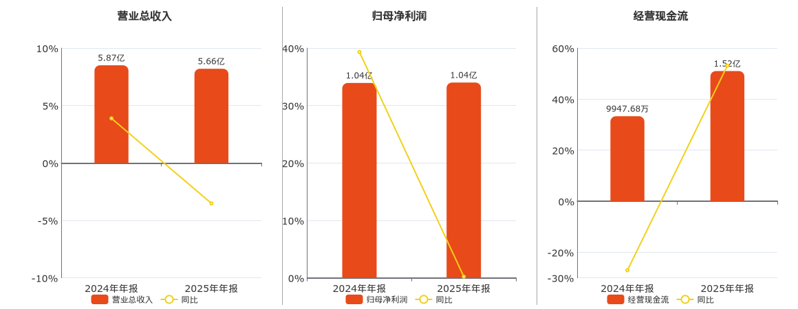 公司营业总收入为5.66亿元,在已披露的同业公司中排名第104,较去年同报告期营业总收入减少2065.64万元,同比较去年同期下降3.52%。归母净利润为1.04亿元。经营活动现金净流入为1.52亿元,在已披露的同业公司中排名第62。