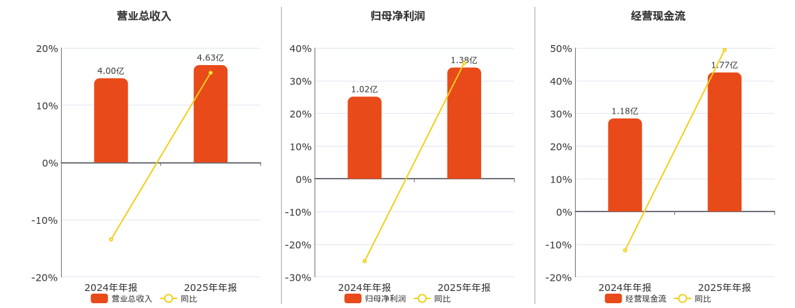 公司营业总收入为4.63亿元,在已披露的同业公司中排名第73。归母净利润为1.38亿元。经营活动现金净流入为1.77亿元。
