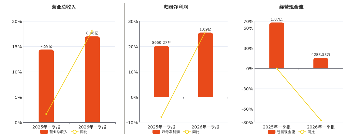 公司营业总收入为8.96亿元。归母净利润为1.09亿元。经营活动现金净流入为4288.58万元,较去年同报告期经营活动现金净流入减少1.45亿元,同比较去年同期下降77.11%。