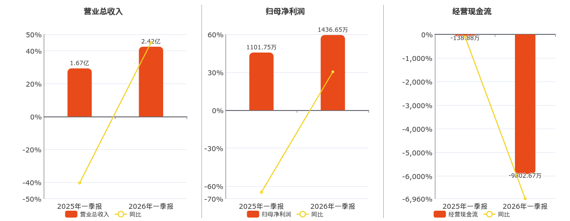 公司营业总收入为2.42亿元。归母净利润为1436.65万元。经营活动现金净流入为-9802.67万元,在已披露的同业公司中排名第96,较去年同报告期经营活动现金净流入减少9663.79万元。