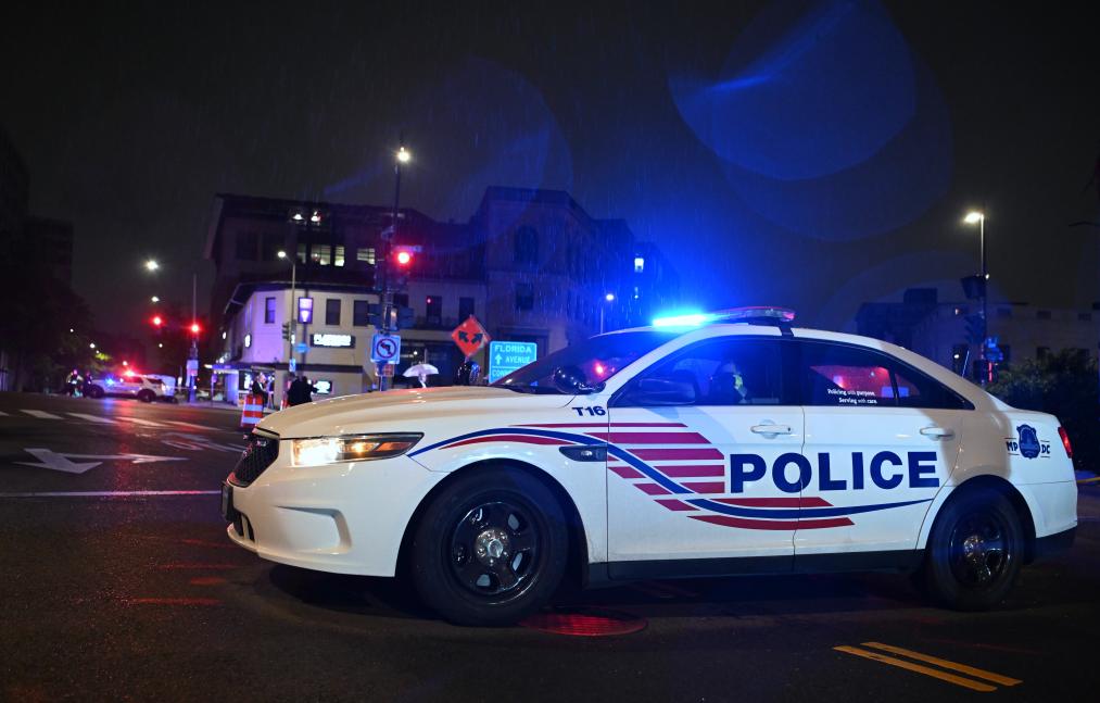 4月25日,警车停在举行白宫记者协会晚宴的美国华盛顿希尔顿酒店附近。新华社记者李睿摄