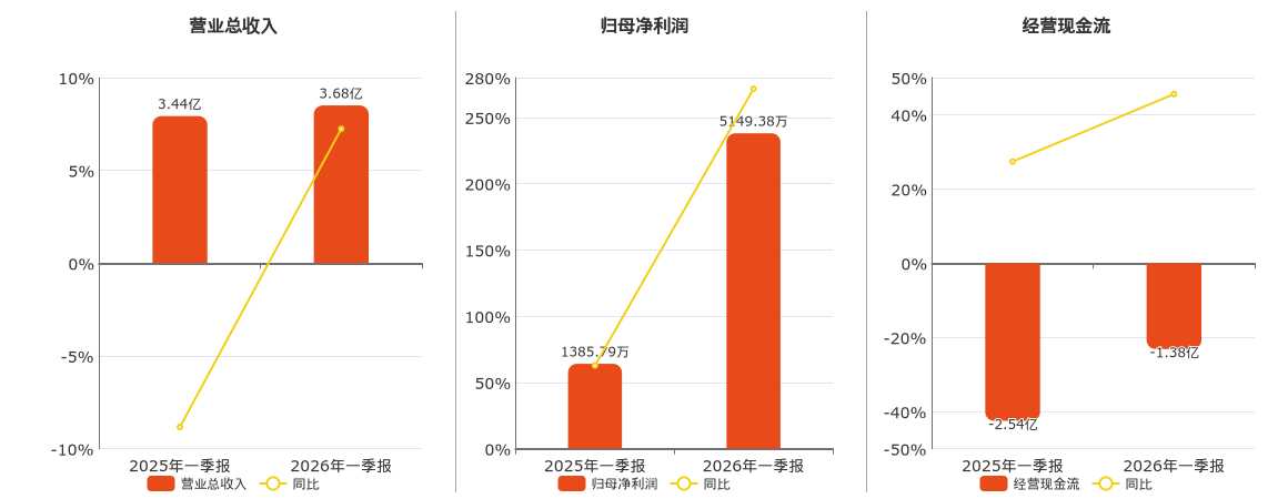公司营业总收入为3.68亿元,在已披露的同业公司中排名第9,较去年同报告期营业总收入增加2486.45万元,同比较去年同期上涨7.24%。归母净利润为5149.38万元,在已披露的同业公司中排名第4,较去年同报告期归母净利润增加3763.59万元,实现2年连续上涨,同比较去年同期上涨271.59%。经营活动现金净流入为-1.38亿元,较去年同报告期经营活动现金净流入增加1.16亿元,实现2年连续上涨。